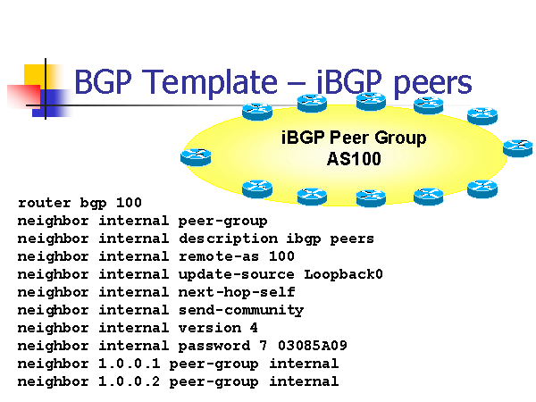 - On this slide I’ve defined a peer-group called internal. I’ve configured a number of BGP features for the BGP peer group: a text “description” of the group; the remote-as (same as local AS as this is IBGP); set the update-source to be the loopback so my peering will survive individual link failures; configured the sending of communities; locked down the BGP version to version 4.; and applied a password.
